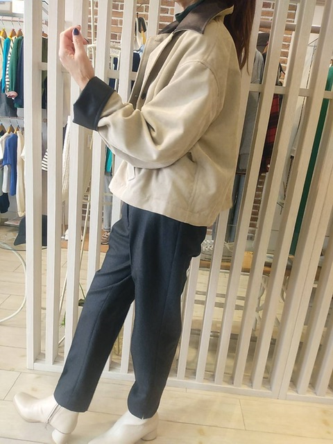 襟と袖口のフェイクレザーが効いてます。