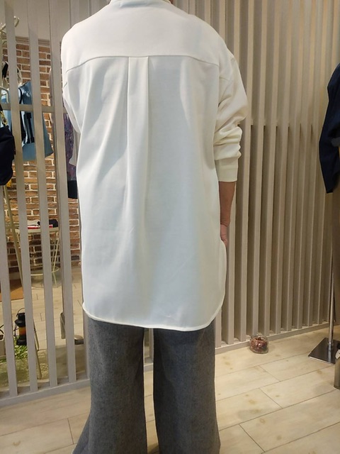 シャツのようなハイネックプルオーバー。